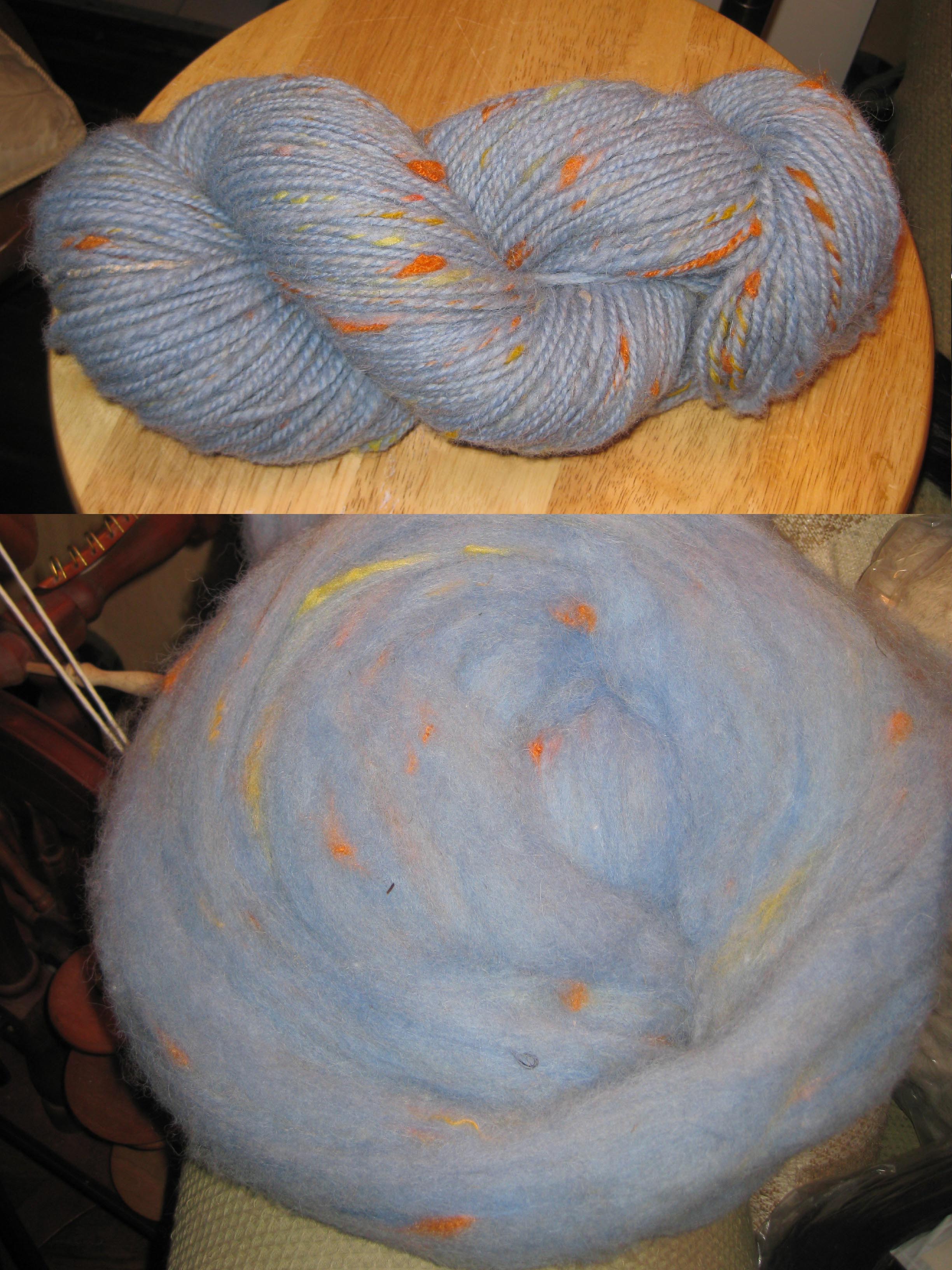 The wool for the blue thrums was a new fleece. I used to buy the clip of a small Shetland herd from a farmer in Maine, but the Shetlands got old and were replaced with white Corriedale crosses. So, no more nice natural colored wool from this avenue, but the white crossbred wool seems to work out nicely. It was dyed with regular old Rit dye and blended with orange, yellow, and red bits. This is what the resulting roving and a skein of the finished yarn looks like: