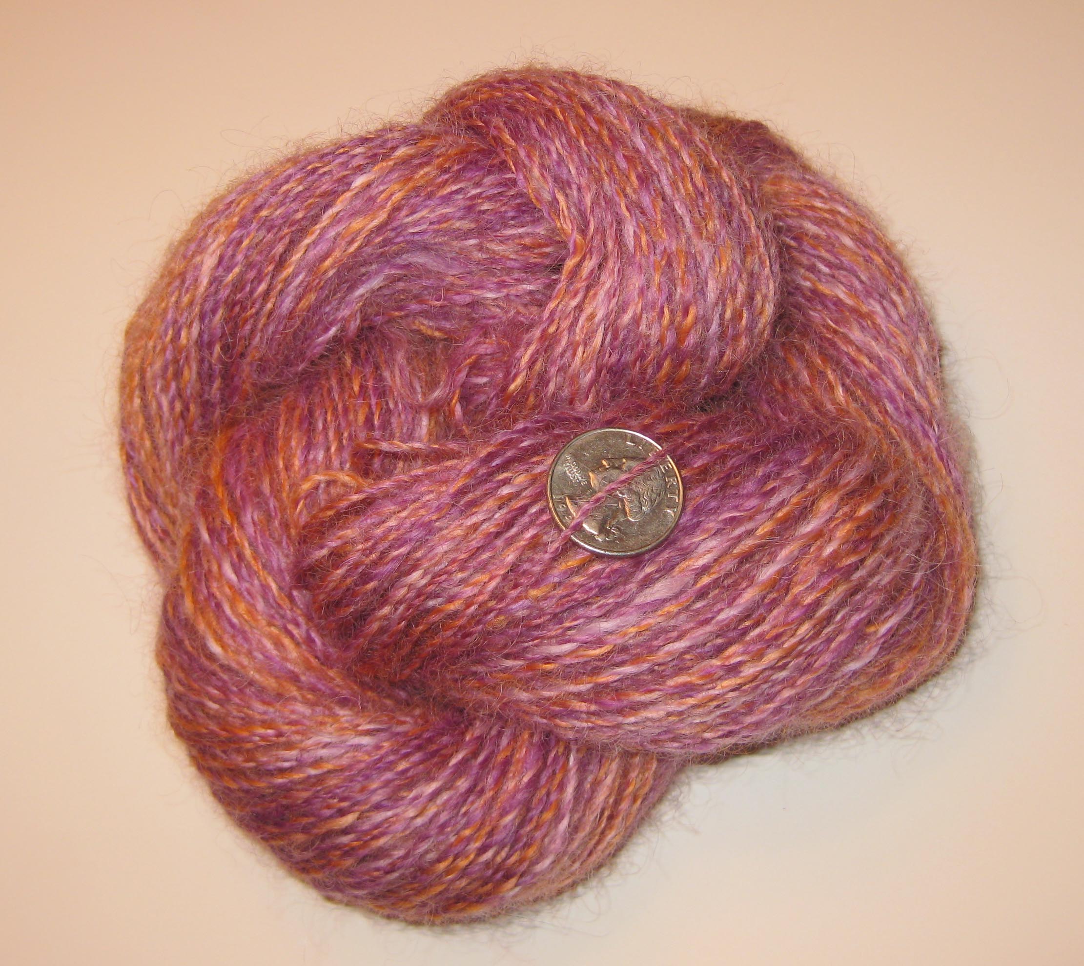 The third fleece got a bit different treatment. One entire little jar of Wilton’s Icing Colors in Orange. And when they say “orange,” they aren’t kidding. A rich, vibrant orange like a daylily. It looked so pretty drying in the sun, it was tempting to just have it carded as is. But, I withstood the temptation and asked Spinderella’s to card the purple and orange twist roving with the orange in the middle. This is the finished roving with a spool of the one strand yarn: