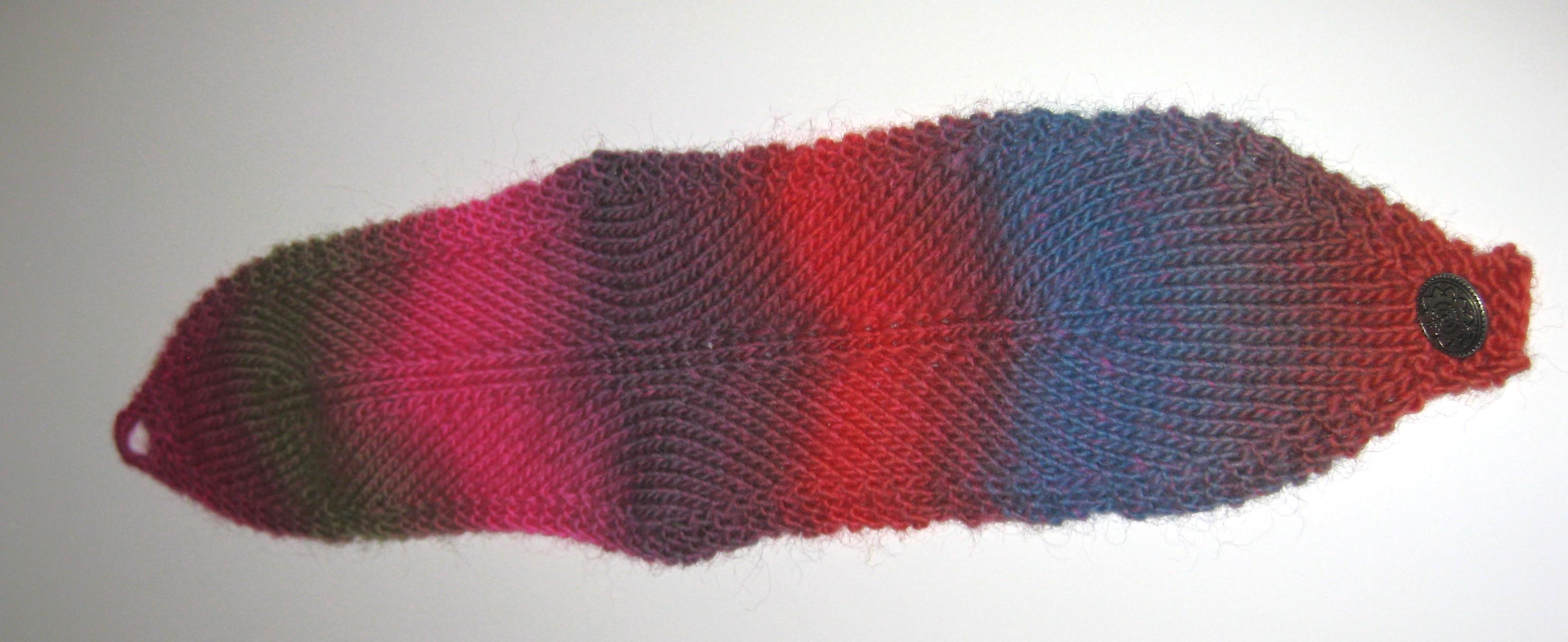 This headwrap from the book, “Handmade Underground Knitwear,” taught me more about shaping with stitches than anything I can remember. It is very simple to knit, as long as you follow the directions. Being an indifferent sort of knitter, I seldom follow directions. But I did with this one and am glad – it turned out great. It is recommended for Jojoland Rhythm, which I happened to have a skein of in my stash. I wasn’t completely happy with either the color or the length, so I made a second on in Wisdoms Yarns Poems and dropped out a couple of rows.
