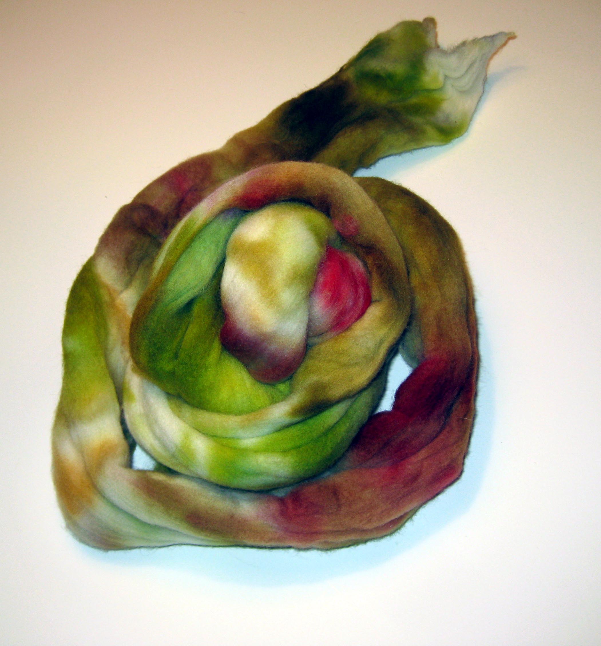 This is Merino roving from Woolbearers in Mount Holly, New Jersey, http://www.woolbearers.com/ . The owner, Myra, demures when I call her the dyemaster, but she is far better at it than I am. I love the earthy colors in this and am thinking socks at this point.