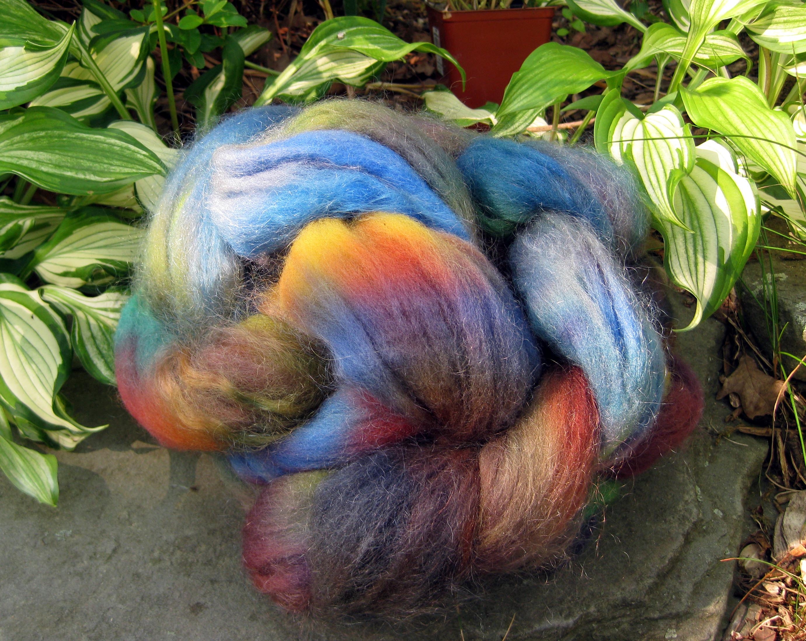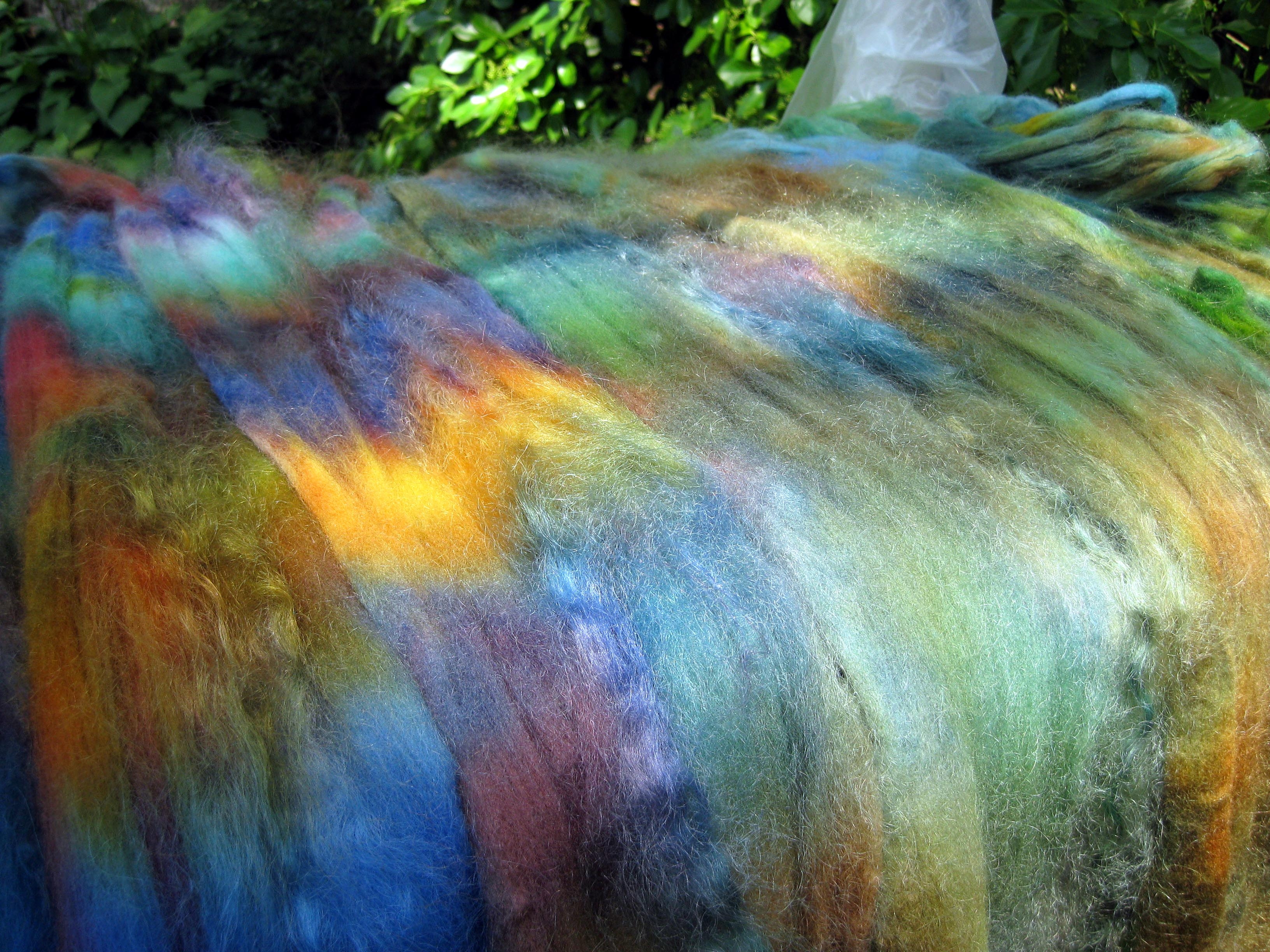 The other thing to note (and new link on the list) is the Sheep Shed Studio in Montana. Fifteen pounds of white roving for around $100 with shipping. These are all the Brown Sheep Yarn mill ends. The one pictured above is the 75% wool and 25% mohair and you can see the vein of mohair running through it. All great roving and I doubt I will ever buy a plain white fleece again because, by the time I get through washing and processing, I have spent double what it would cost to just get it from Sheep Shed.