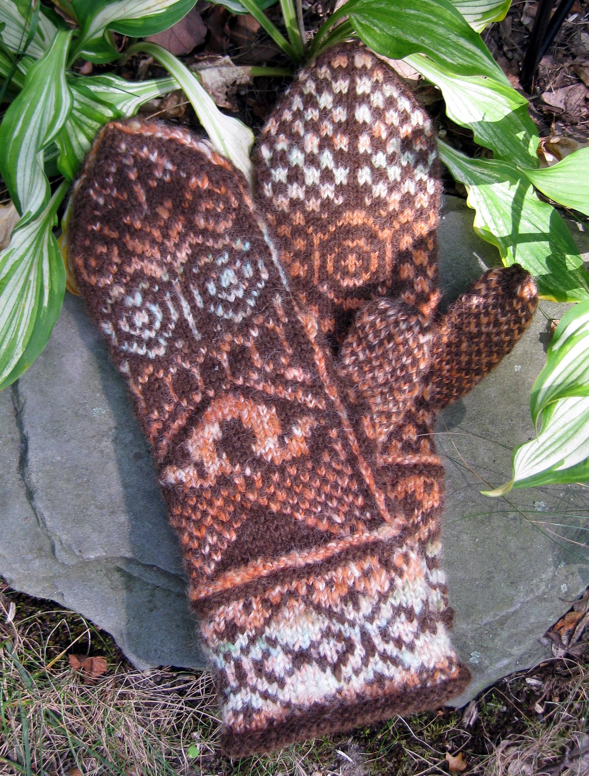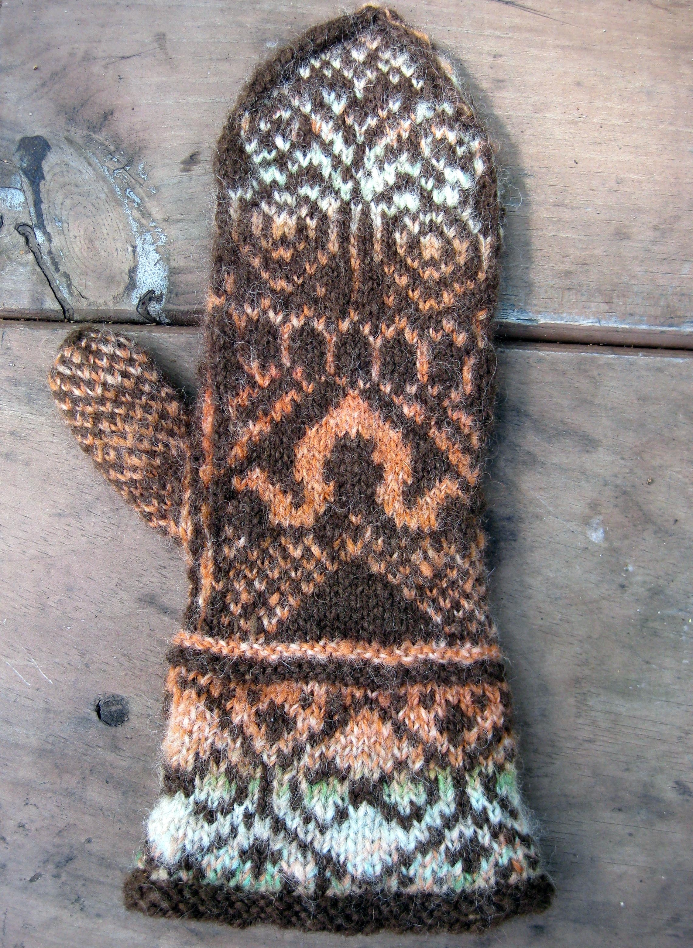Maybe it was because I had a skein of handspun in an orangy color and knew Casey would like it, because she had bought the corresponding skein from me a year or so ago. Maybe I just downright took leave of my senses. I had never done charted knitting prior to the Rivendell Socks, and they were in one color. The Moth Mittens required 2 colors. I had never done stranded work before, but no matter, I was enchanted by the mittens and had to make them.