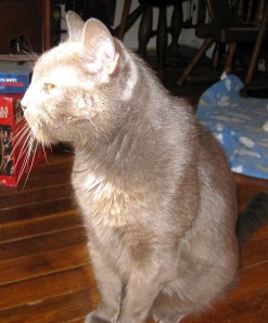 In some earlier posts, I mentioned Grey Cat, our 20-year-old part-Russian Blue rescue who was dealing with a number of medical issues. Grey Cat left us at 2:39 AM this morning, a few hours before we were to take him into the vet’s office one last time. Altruistic as always, he spared us the final pain by deciding his own fate. He departed quickly; one second he was with us and the next second he was gone. His tail fluffed out to full width and the hair on his back went up a bit. Perhaps as he crossed through the shadow between this realm and the next, he wanted to warn off any possible interlopers. And then, he was gone into the night.