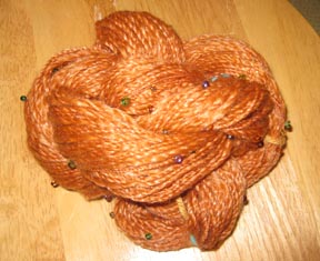 In the meantime, with Christmas over came things like the New Year’s resolutions to do things like reorganize the fiber room. A happy surprise was a little over an ounce of copper colored merino and silk blend I didn’t even know I had. I still had copper and green beads strung on a copper colored binder from some coopworth I had been spinning, so I divided up my little bag of roving, spun one as a single, plied the other with the beaded binder thread, and plied them together. Here is the result: