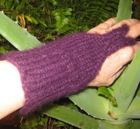 They really are wrist warmers, as they do not cover much of the hand. They are good for work, where I tend to get chilly working at the computer. The little loop really doesn’t get in the way or annoy. This was a simple pattern that I varied somewhat — I did the cuff part in K3, P1 rib, rather than stocking stitch. Then there is a row of K1, P1 twisted rib stitch that adds some definition. Then strait stitch that decreases into an I cord for the finger loop.