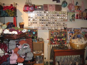 There is a nice selection of needles displayed behind the checkout counter. Believe me, not an inch of space is wasted here! A largish space is set up like a living room with comfy chairs and was filled with knitters. I did not bother them for a photo, as they seemed so happy to be chatting on their projects and I had already burst through them a couple of times with yarn and roving from the back room.