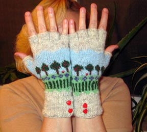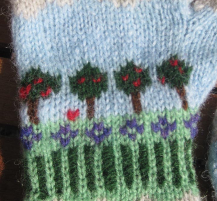 I left the rain out, however. The sky part had little half-stitches duplicate-stitched in; they were supposed to be cobalt blue. I decided I’d rather have Sunny Day Fingerless Gloves. And the little apples are cute, I didn’t want to detract from them: