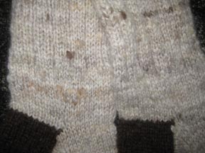I finished one sock. Zoe’s fleece was also variegated, ranging from a cream to a brown. It made a nice tweedy effect with the dark brown spots mottled into the lighter cream. One sock finished, and the ribbing of the second one begun.