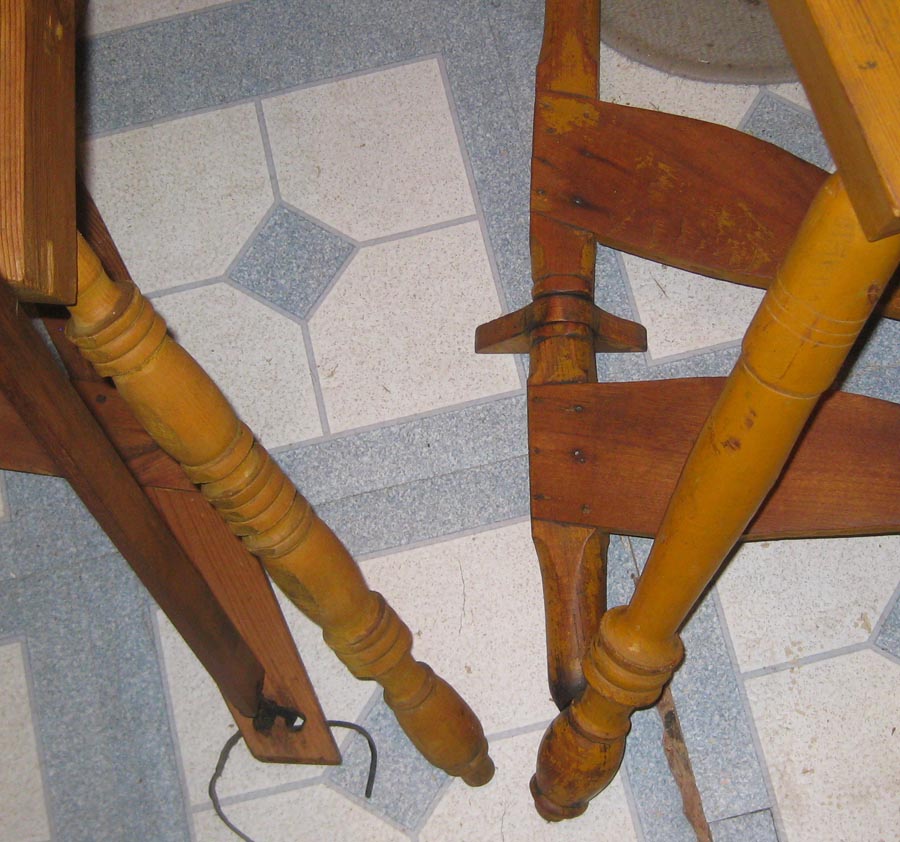 Because the smaller wheel has only a 25″ drive wheel, the debate rages as to whether or not she is considered a Canadian Production Wheel or not. She definitely is Canadian and was purchased in Quebec, she shares the same attributes as the larger wheel, and possible shares the same maker. At least, she shares the same patterns on her turnings.