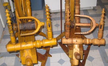 The bigger wheel is a double-treadle Canadian Production Wheel, believed to be by the maker, Ouellet.
