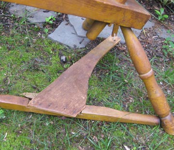 She has that lovely swooping treadle. The treadle needs to be renailed to the front crosspiece, but this is an easy fix. I like the amount of wear on the treadle — someone obviously did alot of spinning with this wheel.