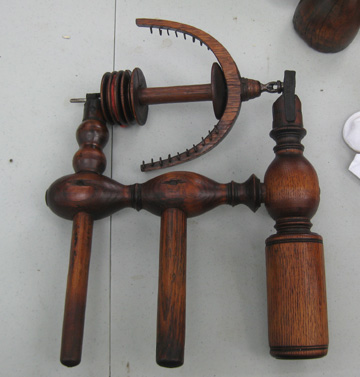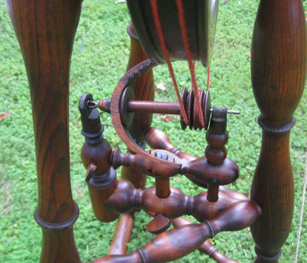 The pegs on the left and in the center fit into a crossbar; the piece on the right fits against the end of the crossbar and is held in with a wooden screw. I’m always nervous about stripping or breaking the screw when tensioning. If it goes, I would need to find a woodworker to turn another one before I could get this spinning again.