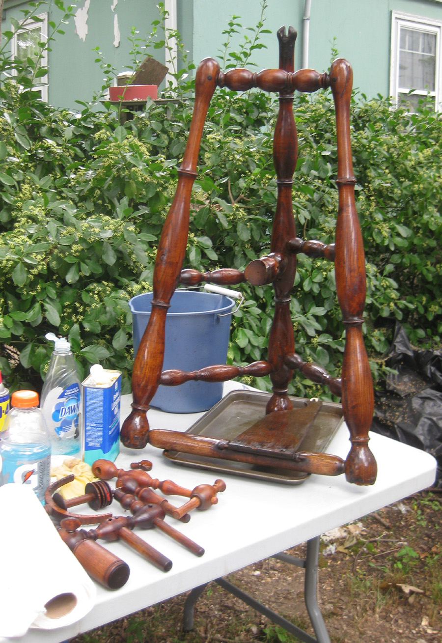 One of the major pieces I wanted to get cleaned was the Irish Castle Wheel. I love this wheel, but rarely use it for spinning. This was more of an antique display wheel. Here it is dismantled for cleaning: