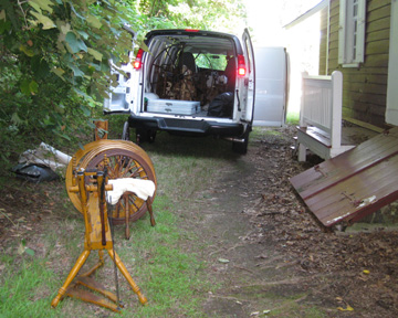 Once arrived, the issue of where to park had to be dealt with. The Holmes-Hendrickson House is very small, and sits on very small plot of land on the top of a steep slope. John did not want to drive the van around the front of the house; he was afraid the van would roll over down the hill. However, there is an about-12 foot strip of cleared land behind the building. Sooooo….