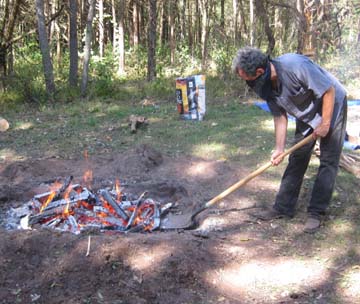 Our fire was not quite as large, but certainly as hot! John uses a hooked poker to get the lids on and off.
