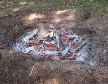 Cooled and removed from the ashes, the firing pit was pronounced a great success. Almost every piece had fired properly, very few had broken, and most rang out with a lovely tone when tapped with a stick.
