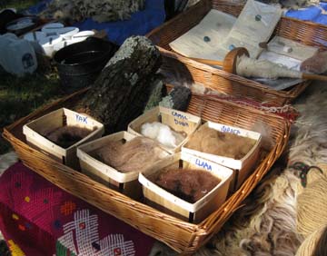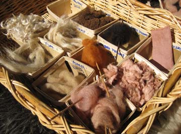 I used our regular craft show table, but covered it with 3 sheep pelts: a white Icelandic, a shaela frost Shetland, and a brown Navajo Churro with sunbleached tips. I found a basket wholesaler from who I bought several rattan trays. I was able to find wooden berry baskets from the Texas Basket Company, and lined the trays with rows of berry baskets that held fiber samples: