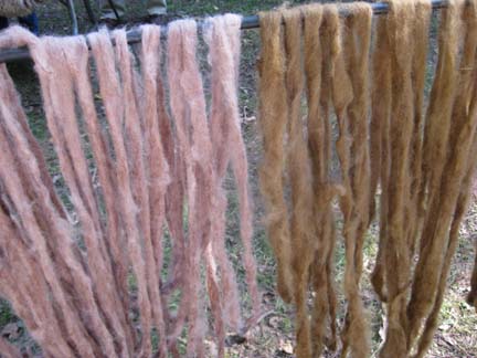 On the left is the pignut hickory dye which produces a remarkably clear rose pink. On the right is the black walnut dye.