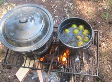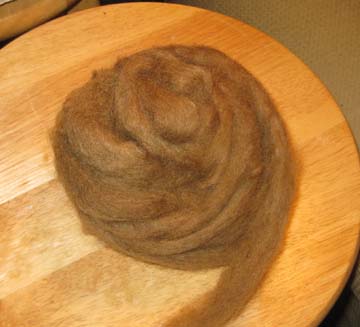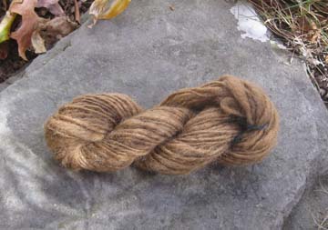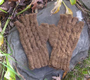 I didn’t even use a pattern. I just had a vision for a pair of men’s fingerless gloves with a simple cable twist up the back, but the cable came undone and became the fingers. The center cable does this; the ones on either side — its their outer side cuves that forms the fingers. This is knit from the wool walnut-dyed at the Primitive Technologies weekend. We went from this: