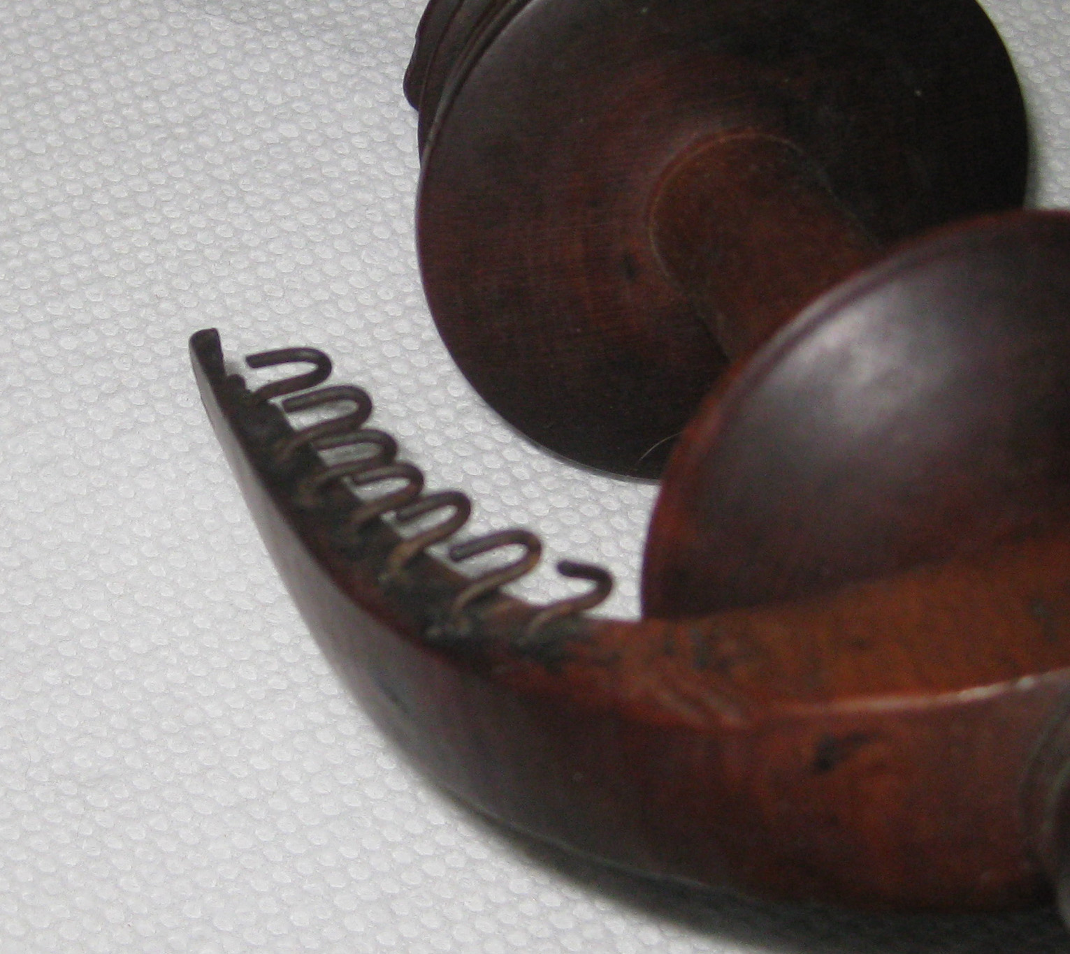 The flyer arms on this piece are sturdy and do not show signs of repair. The hooks on one side are in good repair: