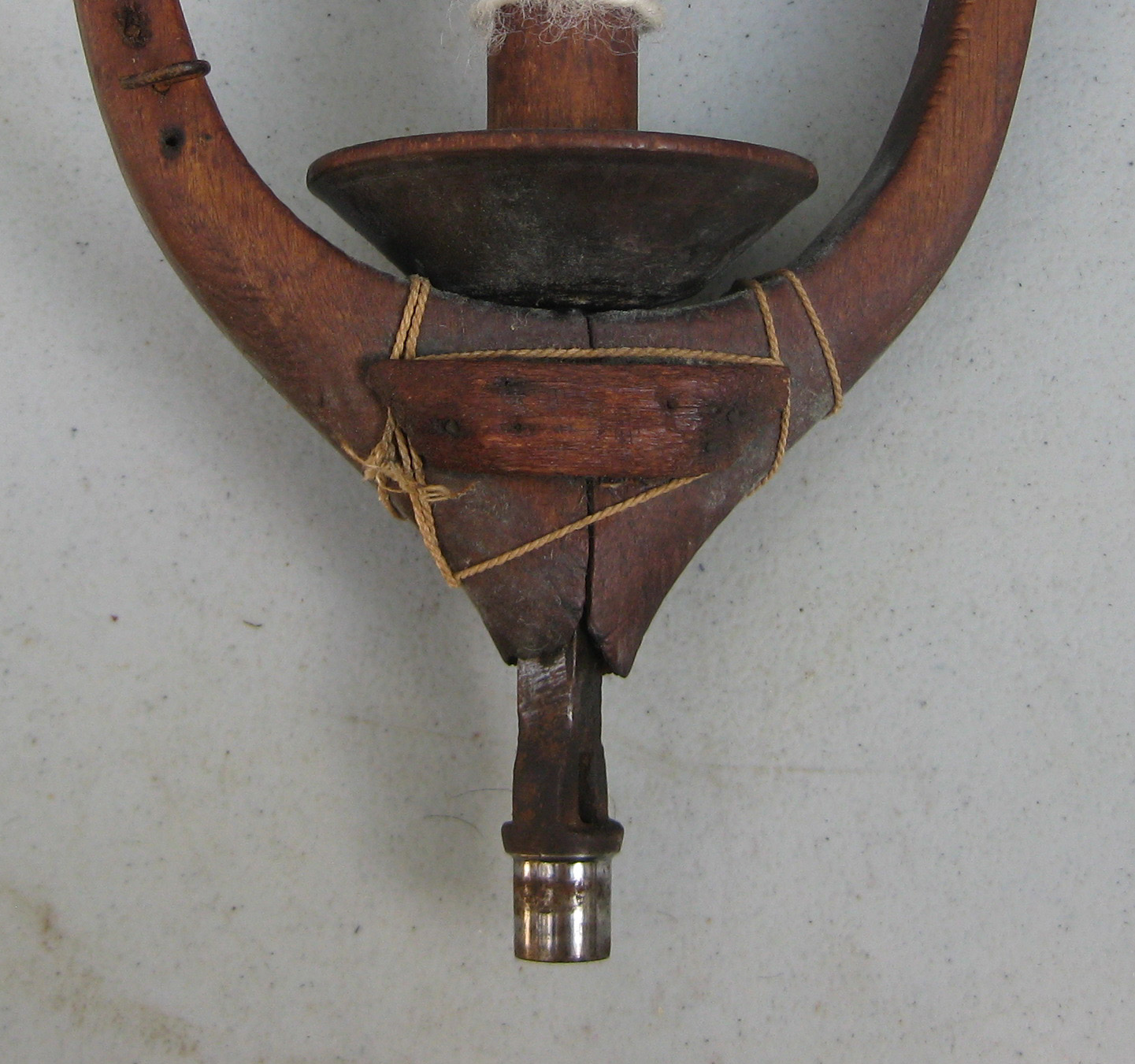 Functional repairs are a part of the piece’s history. This wheel, which is an excellent spinner, was obviously well-used by someone who wanted to keep it going. But eventually, most repaired areas give up the ghost and that is exactly what happened with this flyer. It had been lashed together for who-knows-how-long but when the whorl and bobbin were removed, the spine would drop out of the flyer base. If the spine is loose enough to turn by itself and does not turn the flyer, the wheel will not spin yarn.