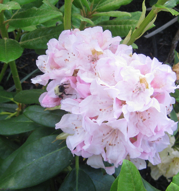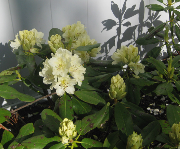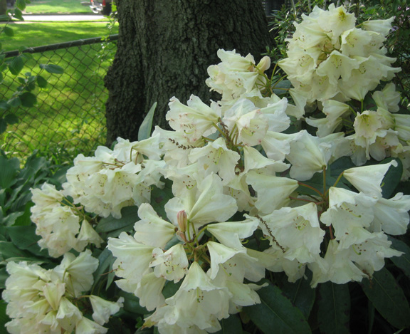 Victoria’s Consort is interesting because it is billed as a white rhody with a yellow throat. Eventually, you do get a creamy white but they start out a very pale mauve with a darker bud. After a week or so, they go to this:
