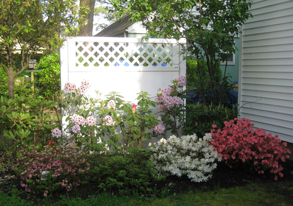 I have a fellow who helps with gardening and he installed the section of fence and the crabapple tree to the immediate left of the fence. I put in markers for him to dig the holes and I dropped in the shrubs. We have a great working arrangement this way. Some of the rhodys in this section are: