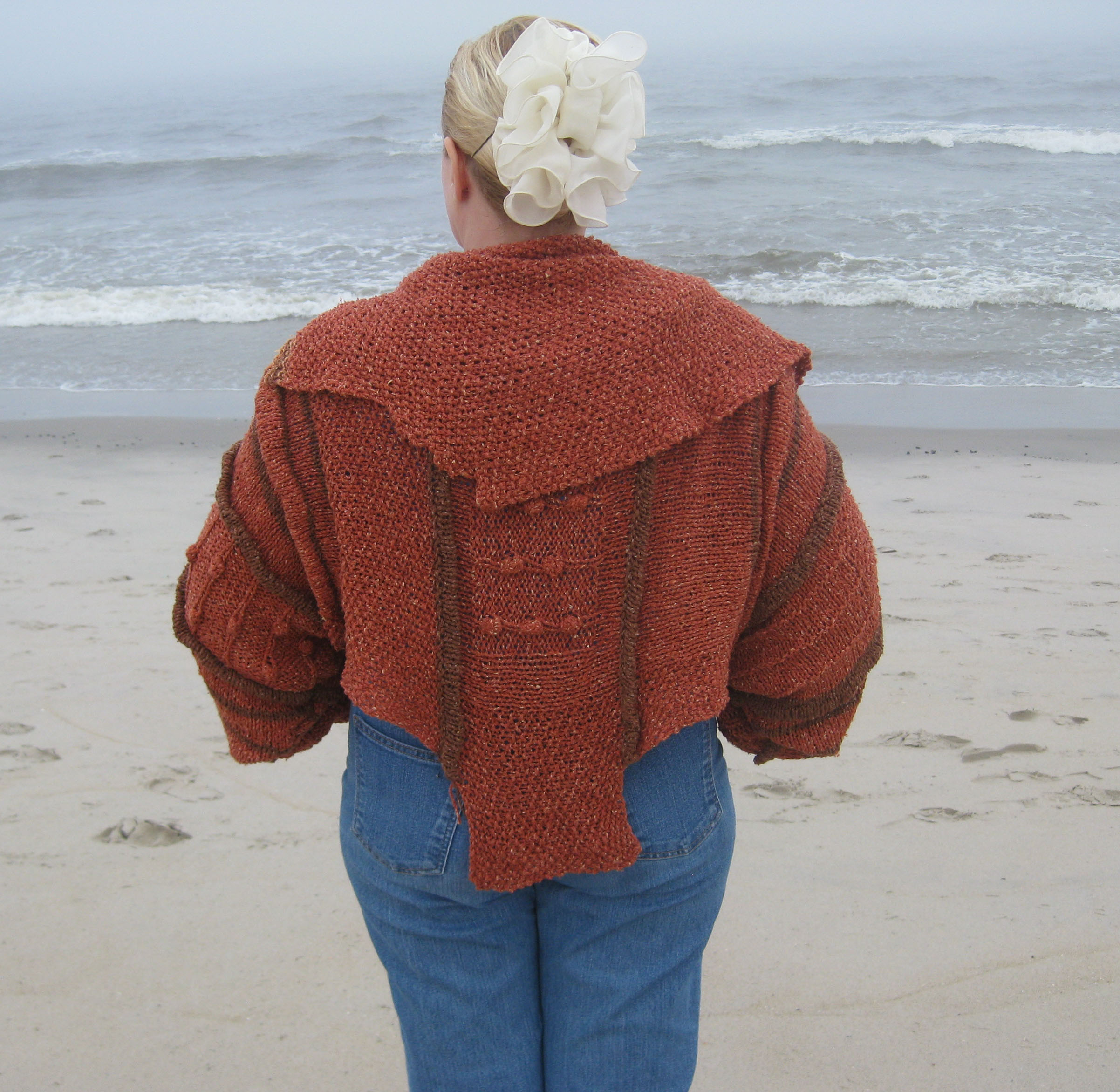 The Enniscorthy Bolero has an asymmetical closing and a huge, sweeping collar that doubles as a hood. There are miles of moss stitches in this!