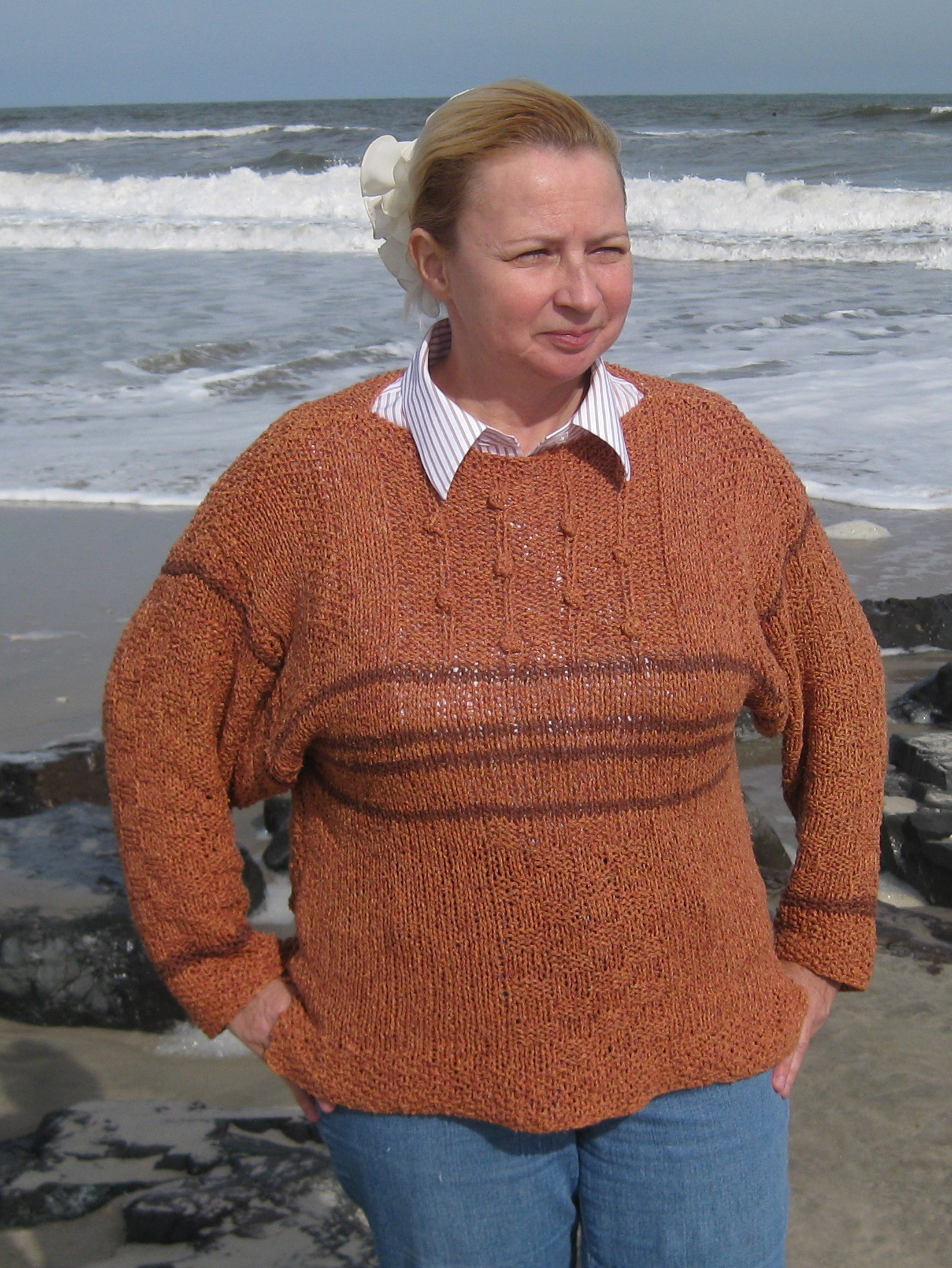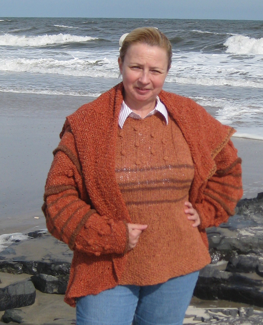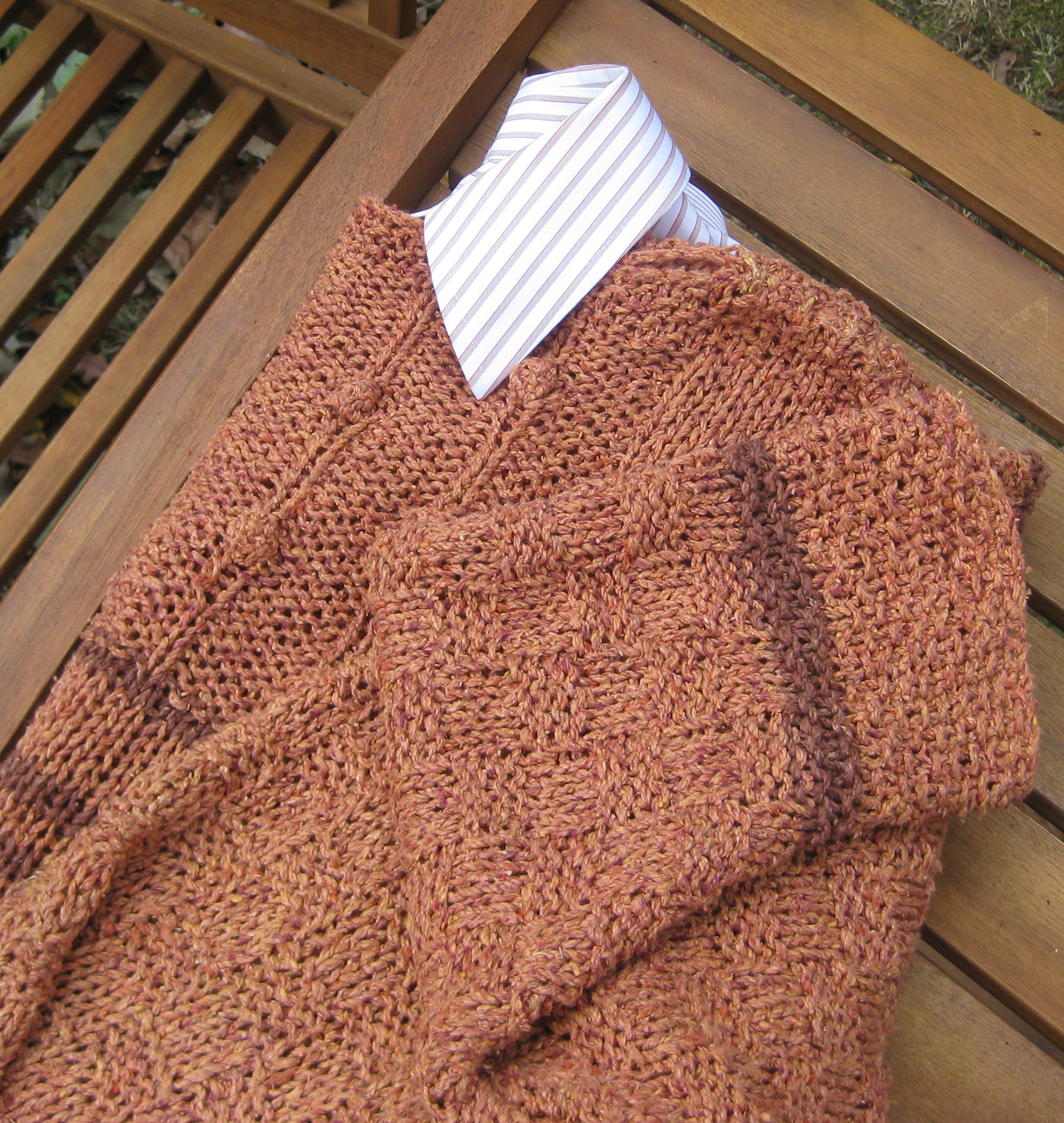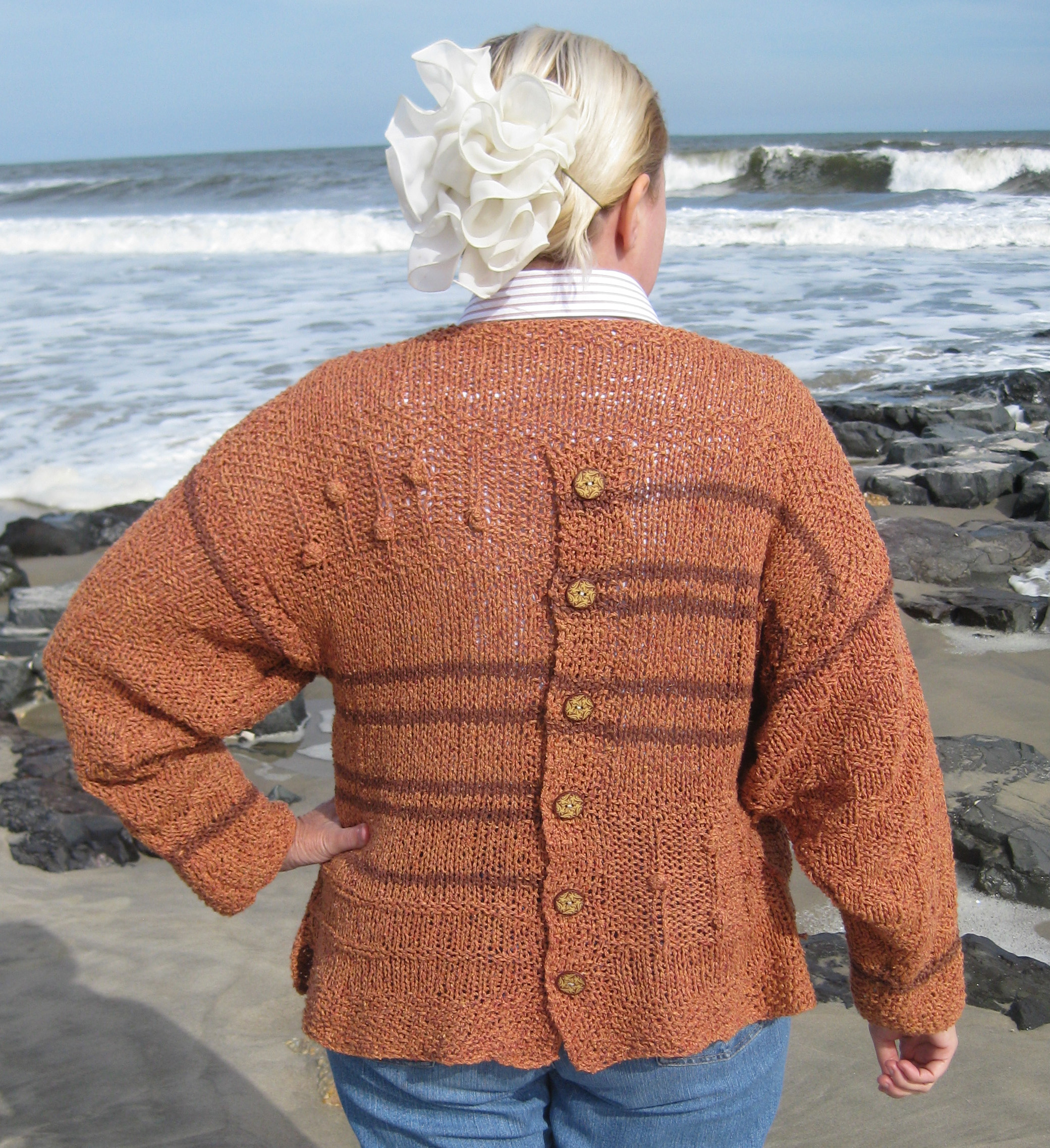 Yarn is Rowan’s Summer Tweed: Sweater is mango, bolero is torrid, contrasting stripe is toast. Bolero on a size 9 needle, sweater on a size 8 and this helped with sizing. The bolero is a tiny bit large on me. Great buttons from the local JoAnn’s crafts.
