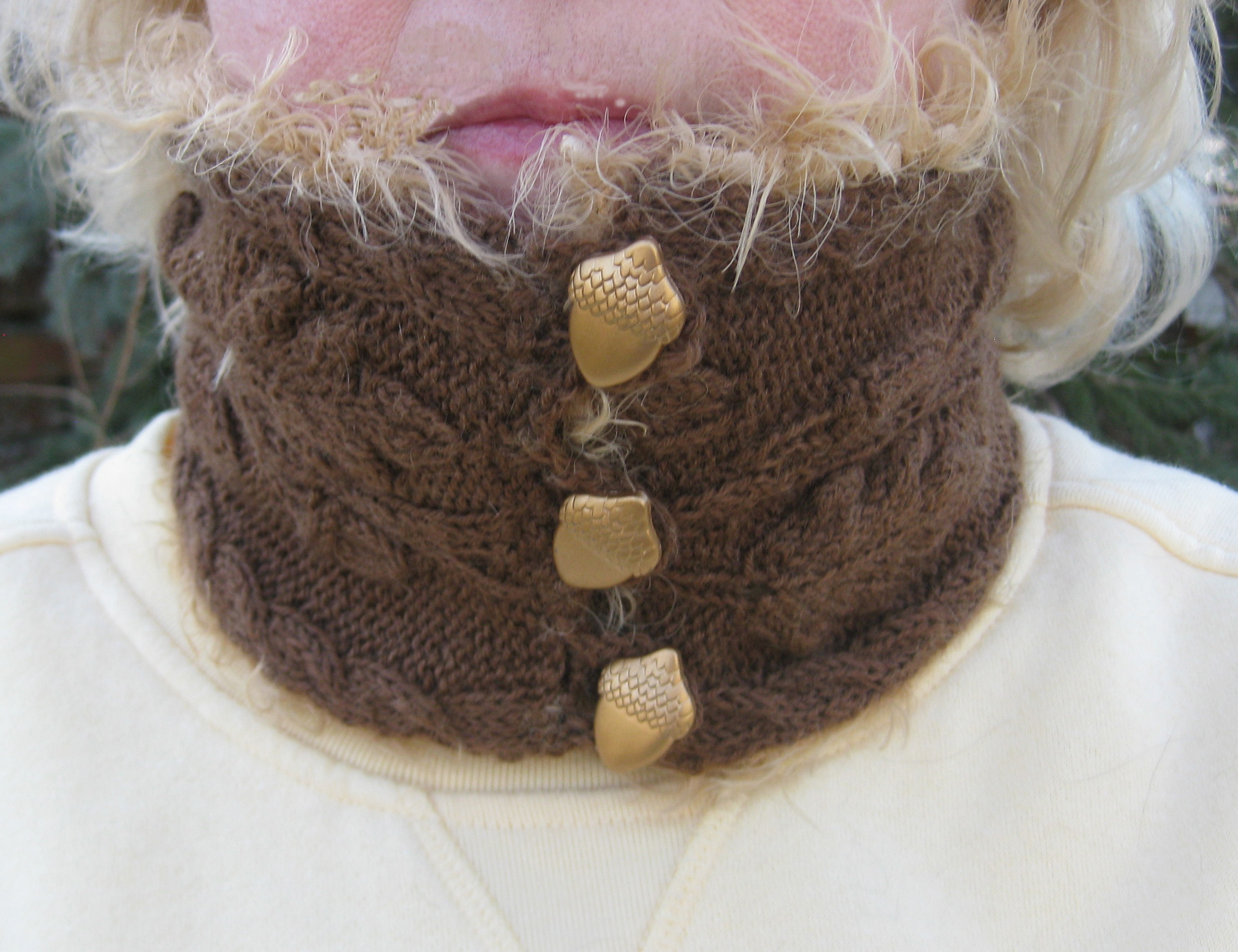 I had wanted to try out the oak leaves and acorns vine pattern and determined this would be an excellent chance. I used a Lion Brand sock yarn in the colorway “Root Beer,” and a cream-colored fun fur called “Lady.” Instead of a cowl, I made a button front neck gaiter.