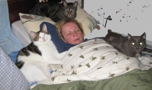 From left to right, that would be Emlyn, Lemur (on my head), and Grey Cat.